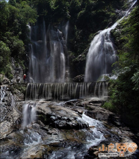 我们艰难行走,忽然轰隆的声音由弱到强灌入耳鼓,我们不由为之一振,极目远眺:“啊”,向往已久的瀑布就在眼前,瀑布从悬崖绝壁直泻下来,倾珠泻玉,像少女头上的白纱布,又似天穹无暇的浮云,纵有“雪练拖穹,银云垂地”之词,也无法形容其姿色。 瀑流撞击着突兀的岩石,飞花翠玉般四溅开去,宛如一道流动的诗,我不禁诗性大发地呤上两句“天宫宝库何年漏,不尽珍珠滚滚来。”走上前去,凉风夹杂着迷蒙的水雾扑面而来,我们受宠若惊,尽情地享受大自然的亲吻和洗礼……